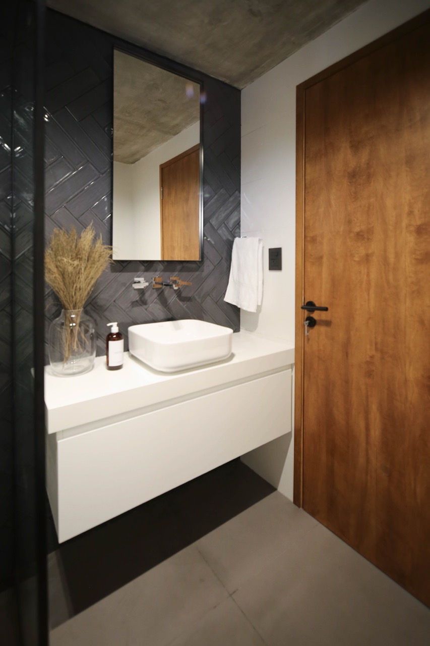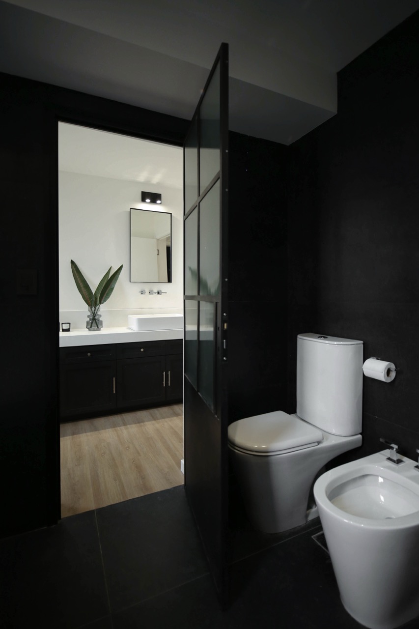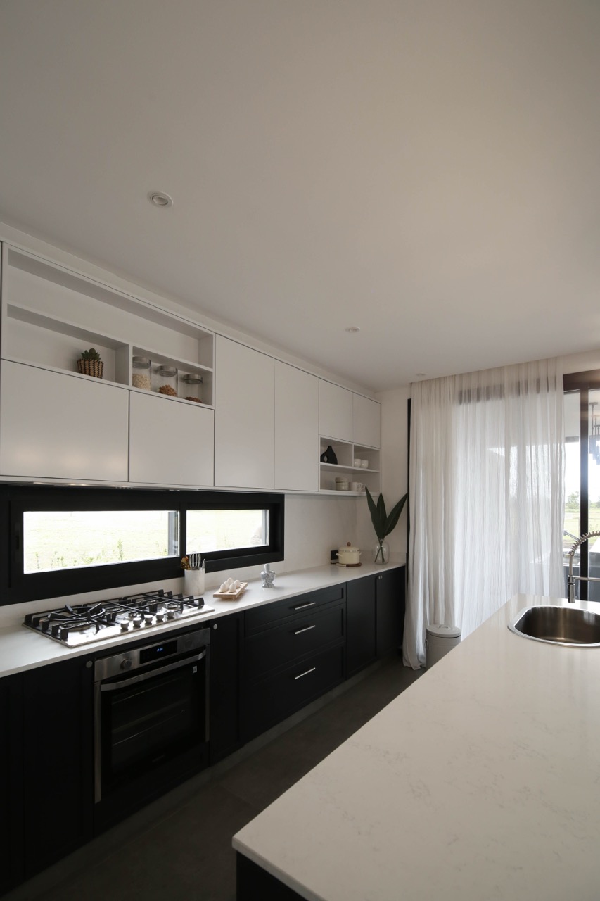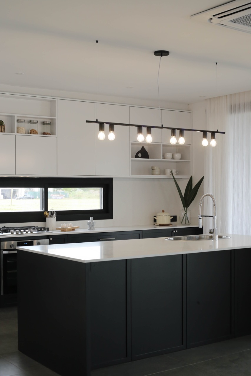 Decidimos utilizar una paleta de colores en blanco y negro, complementada con diversas gamas de grises para crear un ambiente sofisticado. En la cocina, priorizamos la funcionalidad y la estética en los espacios de almacenamiento y las mesadas interiores fueron diseñadas en tonos claros para maximizar la luminosidad.