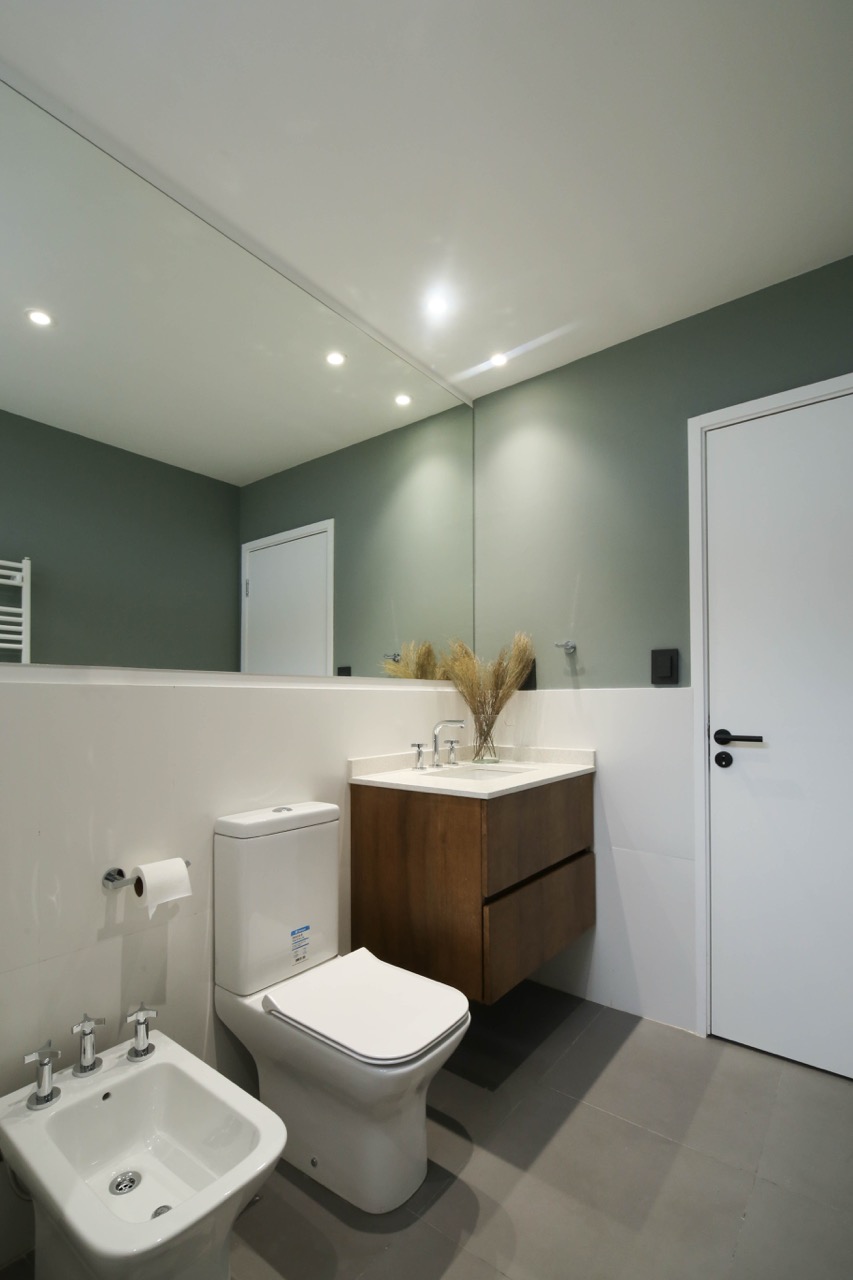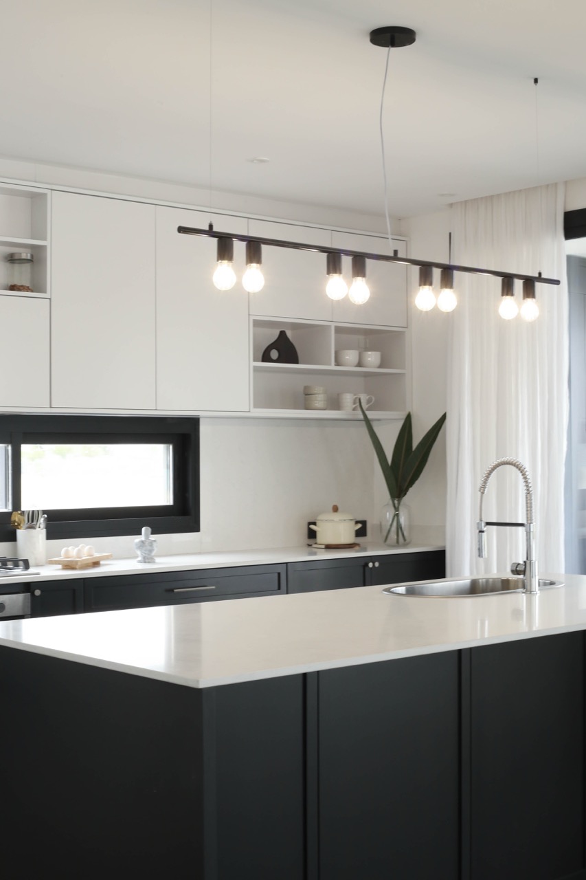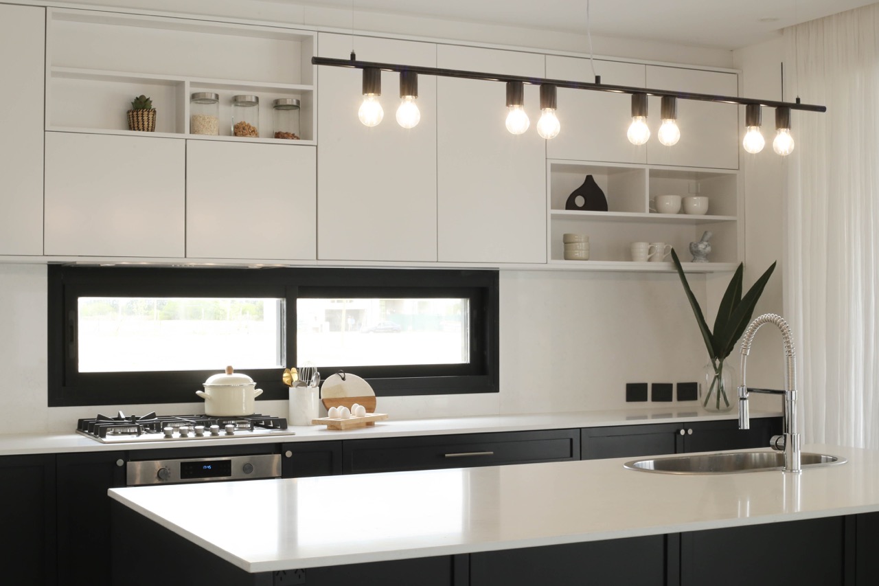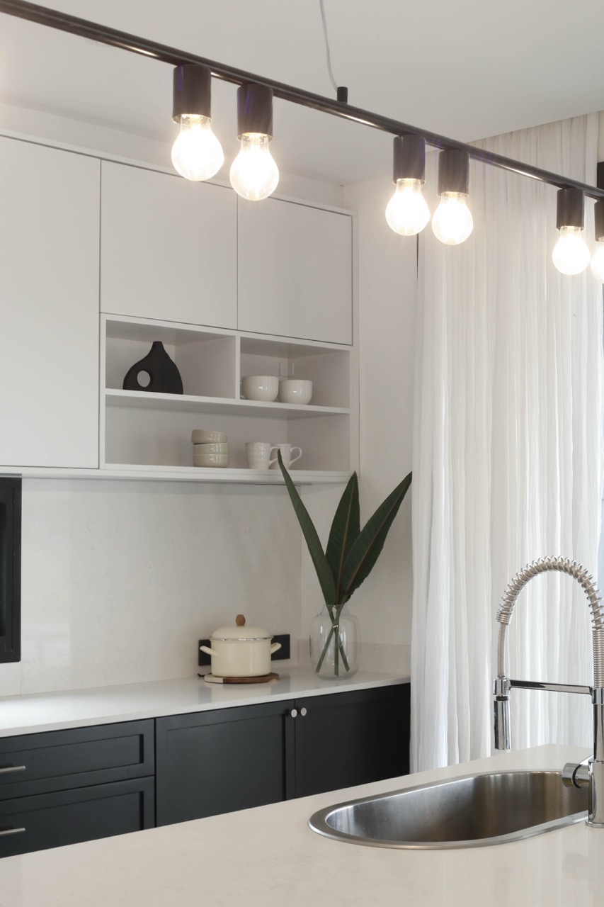 Decidimos utilizar una paleta de colores en blanco y negro, complementada con diversas gamas de grises para crear un ambiente sofisticado. En la cocina, priorizamos la funcionalidad y la estética en los espacios de almacenamiento y las mesadas interiores fueron diseñadas en tonos claros para maximizar la luminosidad.
